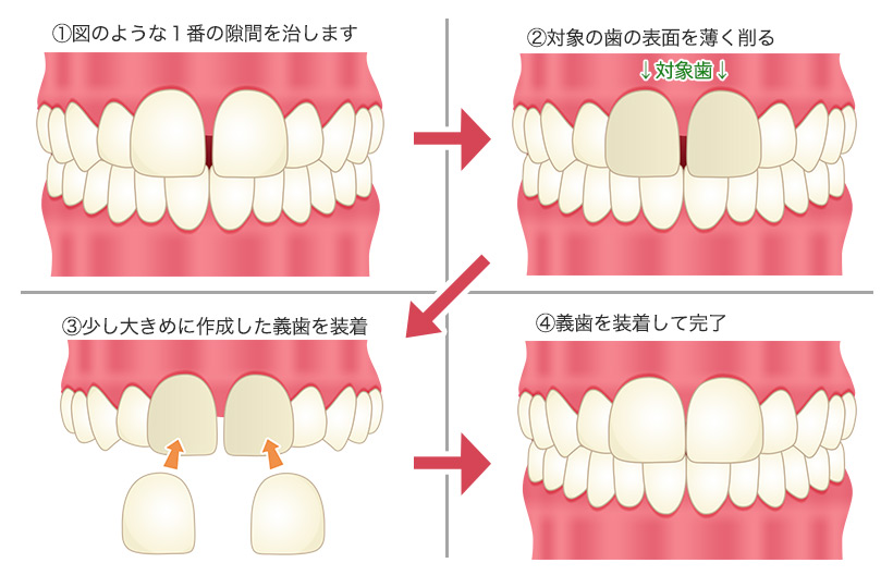 歯の表面を0.5〜0.7mmほど削り、付け爪のような薄いセラミックを貼付け治療します。